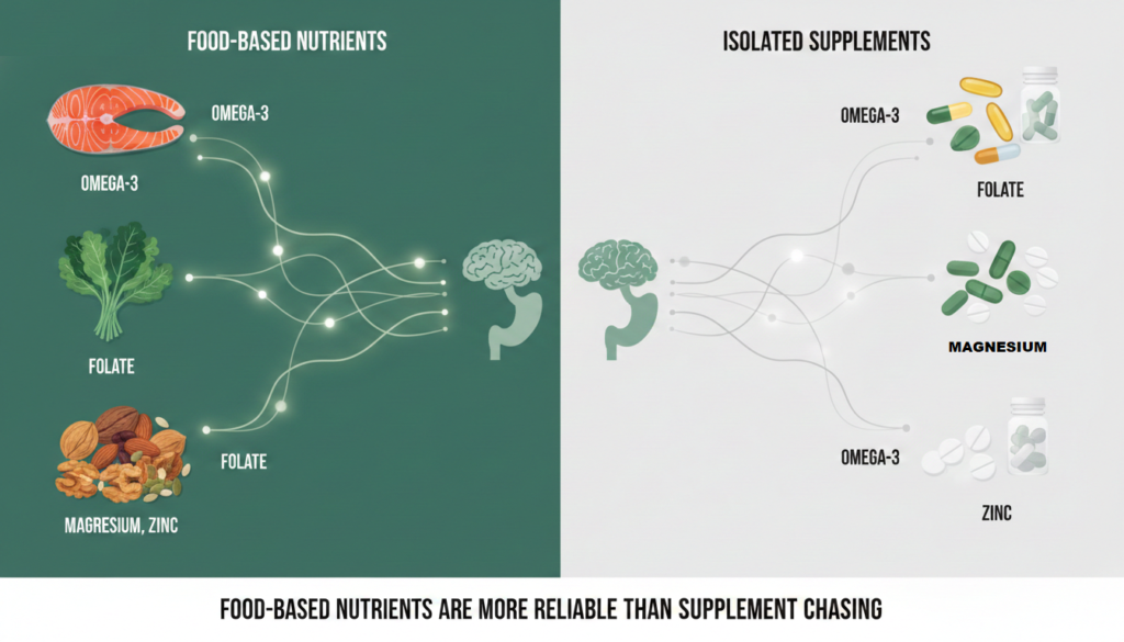 While whole dietary patterns matter most, a few nutrients deserve specific attention because they appear repeatedly in the depression research.