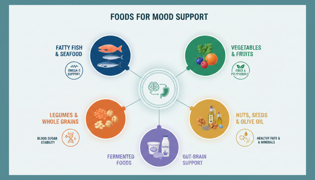 Among all dietary approaches studied, the Mediterranean diet has the broadest and most consistent support for mood benefits. It is not a rigid meal plan. It is a way of eating built around: